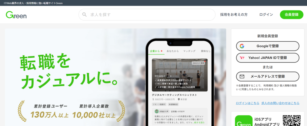 Greenは15,000件以上の求人情報を掲載しているIT業界に特化した転職サイトです。